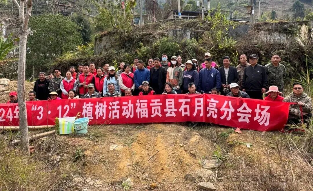 植树现场,几人一组,有的挥锹铲土、有的扶苗填坑、有的培土浇水,干劲十足,到处都是忙碌的身影。经过一上午的辛勤劳作,一棵棵希望的树苗迎风而立、生机勃勃,为美丽石月亮再添新绿。