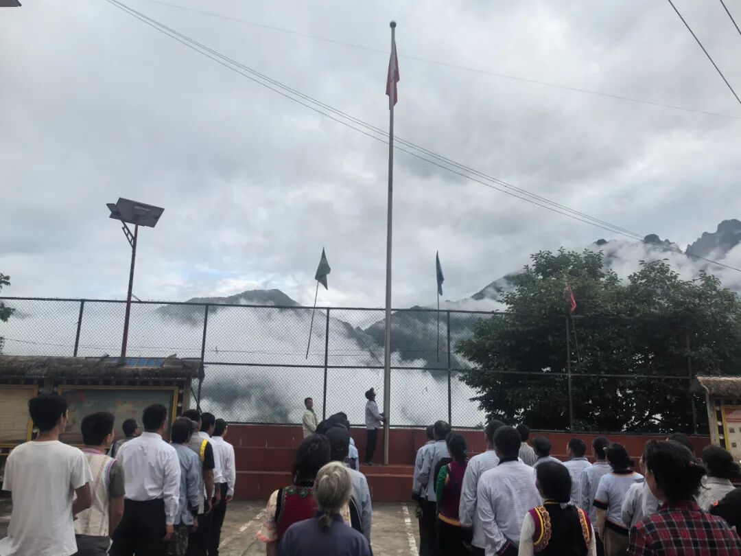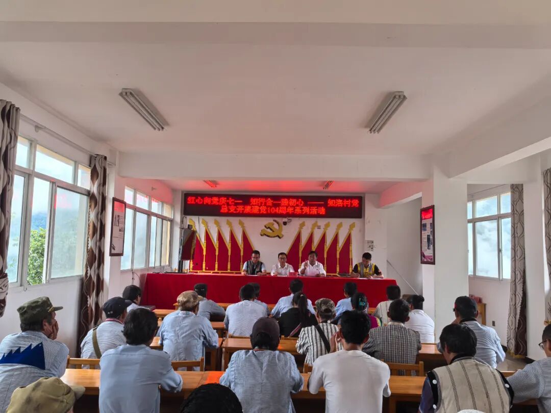 为庆祝中国共产党成立104周年,7月1日,知洛村党总支在村委会组织开展“七一”系列活动,以“仪式教育+理论学习+实践服务”形式凝聚党员力量,全体党员身着傈僳服饰或白衬衫参与活动。