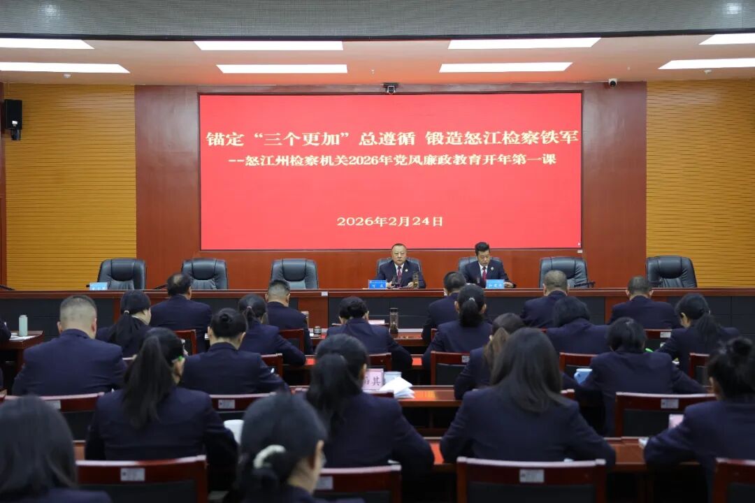 2月24日,新春收假第一天,怒江州检察机关召开以“锚定‘三个更加’总遵循 锻造怒江检察铁军”为主题的2026年党风廉政教育“开年第一课”,为新一年全面从严管党治检、护航边疆高质量发展锚定方向、凝聚力量。州检察院党组书记、检察长可文出席会议并作专题授课,党组成员、副检察长和建培主持会议。